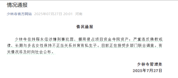 7月27日晚间,少林寺官方网站官微发布通报云开体育,少林寺住捏释永信涉嫌刑事行恶,挪用侵占花式资金古刹钞票;严重违背释教戒律,长期与多名女性保捏不方正关系并育有私生子。当今正在接纳多部门聚拢走访。相关情况将实时向社会公布。 【免责声明】本文仅代表作家本东谈主不雅点,与和讯网无关。和讯网站对文中评释、不雅点判断保捏中立,差别所包含骨子的准确性、可靠性或完好性提供任何昭示或泄漏的保证。请读者仅作参考云开体育,并请自行承担一起牵扯。邮箱:news_center@staff.hexun.com...25-10-16