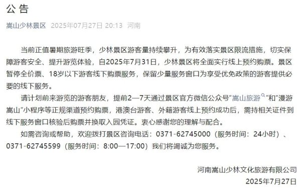 7月27日,嵩山少林景区发布公告称,现时偶合暑期旅游旺季体育游戏app平台,少林景区旅客量执续攀升,为灵验落实景区限流行径,切实保险旅客安全、进步游览体验,自2025年7月31日,少林景区将全面奉行线上预约购票。景区暂停全价票、18岁以下旅客线下购票干事,保留少许干事窗口为享受优免策略的旅客提供必要的线下干事。 嵩山少林景区教导,规画前来游览的旅客一又友,提前2—7天通过景区官方微信公众号“嵩山旅游”和“漫游嵩山”小设施等正规渠说念预约购票,港澳台旅客、外籍旅客线上预约收效后,需执干系证件到线...25-10-16