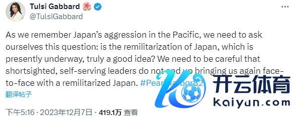日本媒体近日发现,加巴德在社媒平台上曾就日本对好意思国可能组成军事禁绝发出告诫,她还提到对 “偷袭珍珠港” 事件重演的忧虑,有计划言论被局势通信社等日媒称为“腻烦言论”。