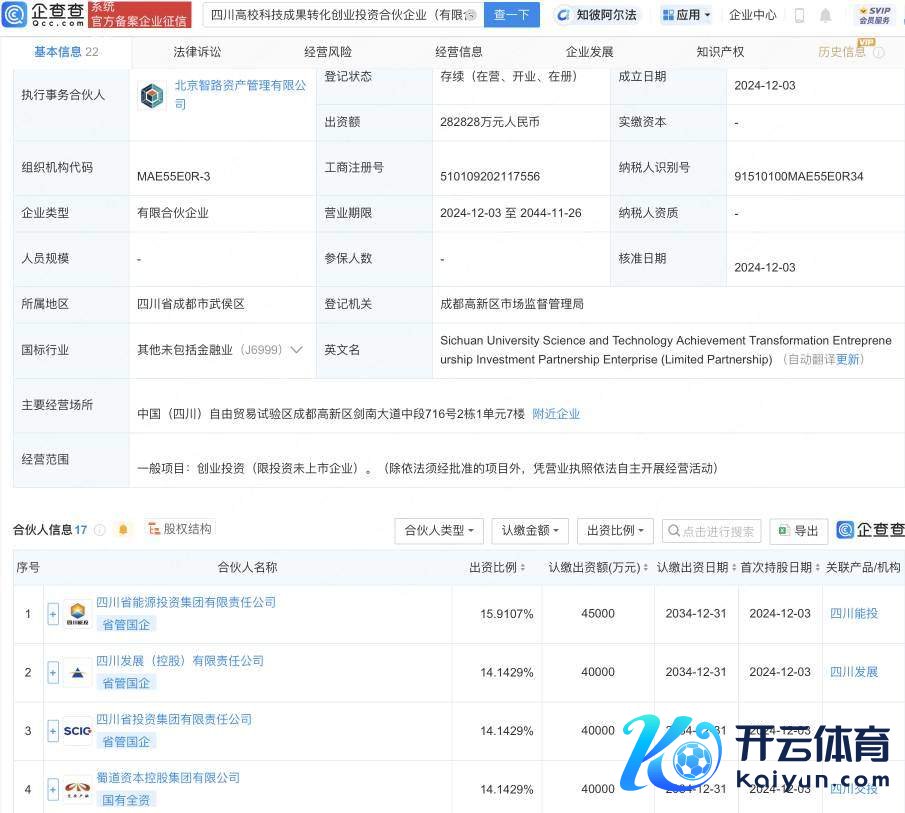 企查查APP涌现,近日,四川高校科技遵守滚动创业投资结伴企业(有限结伴)开采,出资额约28.28亿元,策画限制为创业投资。企查查股权穿线路出,该企业由四川省动力投资集团有限包袱公司、四川发展(控股)有限包袱公司、四川省投资集团有限包袱公司等共同出资。
